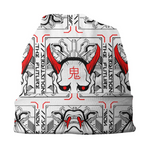 The face of a Yōkai, a demonic Oni, prominently displayed on the front of the beanie lends an intimidating touch to your look. The juxtaposition of this menacing visage against the stylish Japanese kanji letters embroidered on it narrates a tale of enigmatic charm and unspoken defiance, making a statement that you are only sometimes in the mood for casual chatter.