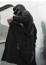 Crafted with sci-fi and cyberpunk streetwear in mind, this oversized hooded cloak is designed to make a statement. The long black straps attached by buckles at the shoulders, back, and front pockets give this techwear jacket a textured, scale-like appearance. The airy feel of this cloak will allow you to move quickly and discreetly, all while keeping you protected from the elements during mid-season weather jolts.